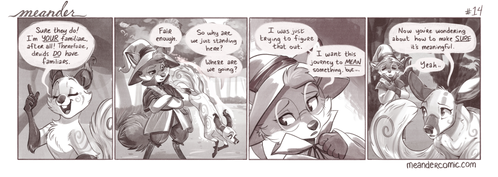 TranscriptWoodsorrel explains helpfully. Clover looks skeptical. Sorrel hops down from her shoulder, transforming into a deer as she does so. Clover looks apprehensive. Sorrel, fully deer-formed except for her bushy squirrel tail, looks back at Clover as they walk down the wooded path. |
